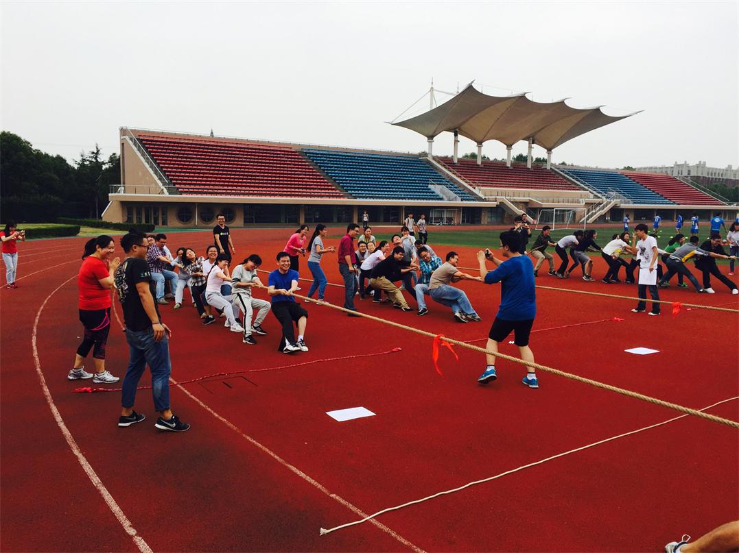 “一鼓作气”项目,每队派出六个人分别抓住绳子来控制小鼓,另外一个人负责将球放到鼓上,通过大家的整体配合,颠球数目最多的组获胜。虽然事先给大家划分了比赛区域,但是由于比赛的热烈进行,大家走过了半个操场。“绳舞飞扬——跳大绳”,刚开始有些老师有点害怕,但为了集体的分数,大家还是勇敢的冲了进去,几轮练习之后,大家也跳的越来越好,紧张感,恐惧感消失殆尽。第三个活动,万众一心也就是拔河,各个队伍都派出了自己的重量级选手和力量型选手参加比赛,大家都为了获得胜利拼尽了全力。