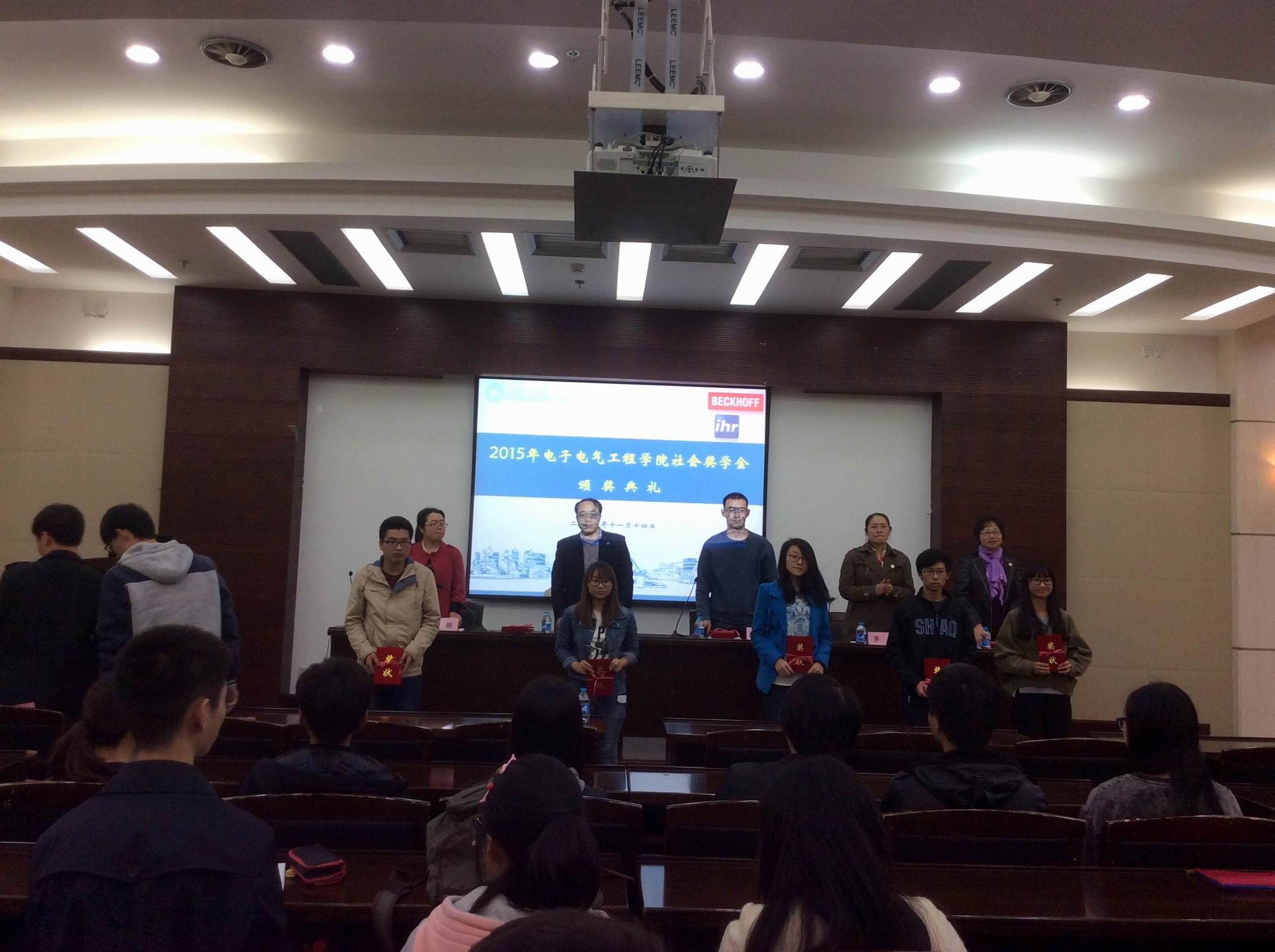 电子电气工程学院党委茅蕾书记在会上宣布了2015年益驰奖学金获奖同学名单,夏则才总监宣布了2015年倍福奖学金获奖名单。伴随真鼓舞人心的音乐,领导们向获奖同学颁发获奖证书。获得一等奖的胡征和董淼同学代表获奖同学感谢倍福公司对学校产学合作和科创项目的支持,同时也感谢老师对他们的辛勤辅导和同学们的合作支持,并表示要更加努力,取得更好的成绩。