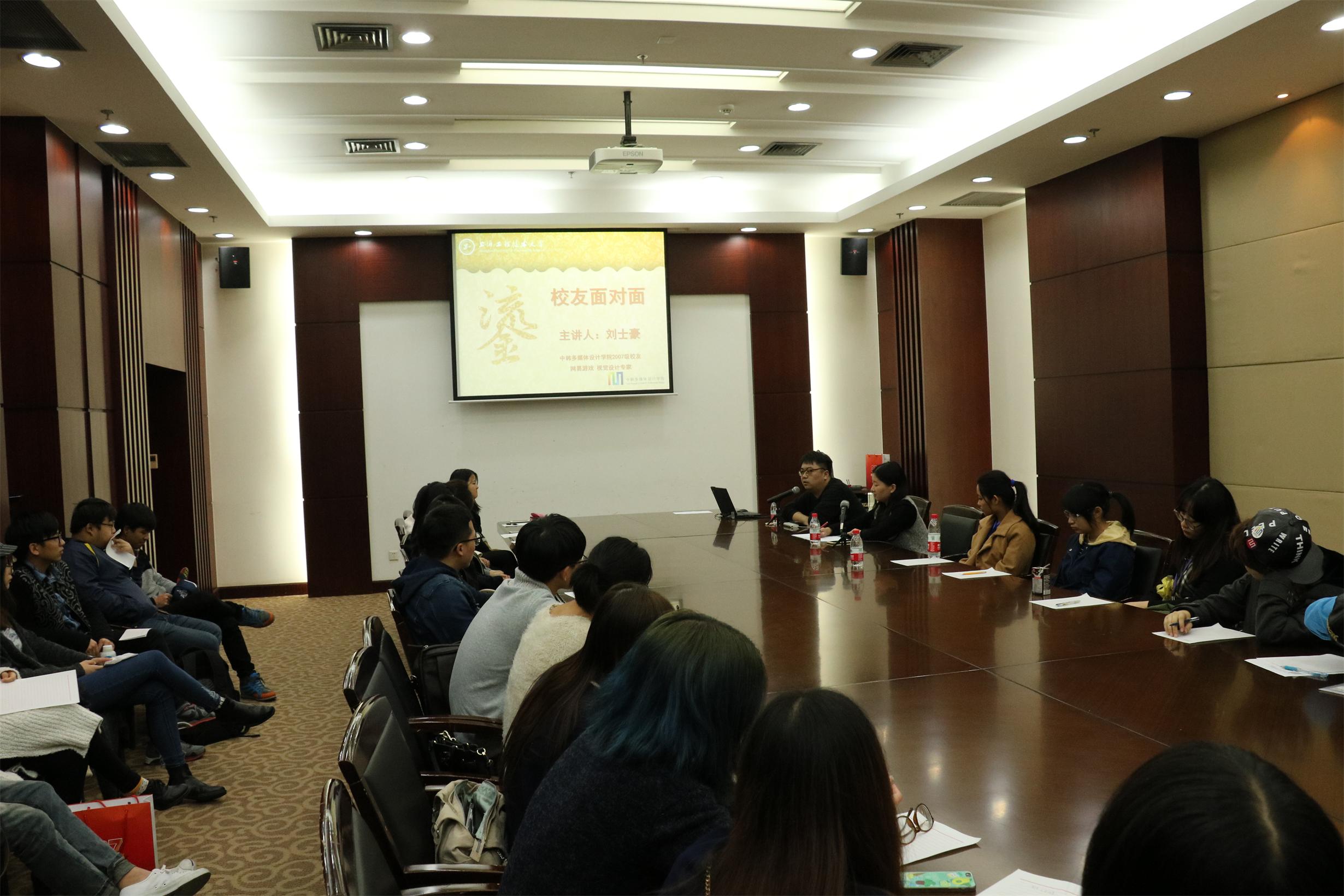 由校友照片组成学院logo的照片墙、带有老师形象的专属明信片、寄托美好祝福的许愿树、切合主题的腕花,无一不给校友们营造一个温馨而又有创意的返校氛围。在“聚梦想•话成长”校友座谈会活动中,唐幼纯院长代表学院欢迎校友回家,也向校友们介绍了学院近几年的发展情况。校友们也与老师们分享了工作和生活中的点点滴滴。唐院长表示学院永远是校友们的家,学院永远是校友们发展和成长的坚强后盾,希望校友们不管是累了还是取得了好的成绩,都能够常回家看看。在校友讲座活动中,学院邀请到2007级校友刘士豪同学。刘士豪现任网易游戏视觉设计专家,学院企业导师、学院2014年度特别贡献校友。在讲座中,刘士豪分享了自己的成长经历,鼓励在校生们能够提升眼界、懂得分享、目光长远,也希望在校生们在取得成功的同时能够回馈学校和学院。