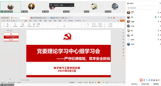 8月5日上午,电子电气工程学院党委在线召开理论学习中心组学习会,开展“严守纪律规矩,筑牢安全防线”专题学习,主要学习筑牢政治安全意识、把保障人民安全放在首位、做好新时代党的宗教工作等方面内容。电气学院党委委员、党政班子成员、党支部书记代表参加学习。会议由学院党委书记王成涛主持。