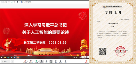 各党支部、系部组织教师深入学习习近平总书记关于人工智能的重要论述,学习《国务院关于深入实施“人工智能+”行动的意见》,组织全体教师参加2025 年度“人工智能赋能高等教育人才培养”系列线上培训并获得培训证书,教师在学习中深刻领会“坚持自立自强、突出应用导向”的核心要求,充分认识人工智能作为新一轮科技革命和产业变革“头雁”的战略地位。