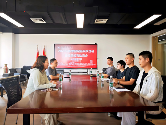 8月31日下午,纺织服装学院2025年秋季预定新兵欢送会暨役前教育动员会在行政楼1805会议室举行。学院党委副书记谢志霞、征兵工作专职辅导员和即将参加役前集训的学生参加欢送会。