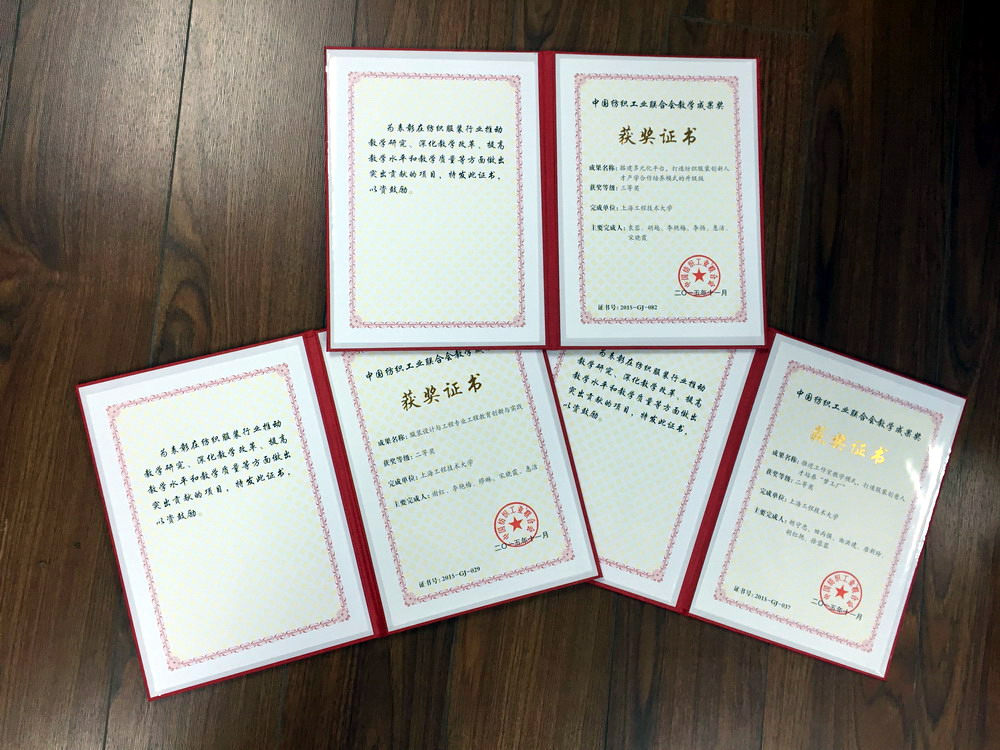 由谢红、李艳梅、缪琳、宋晓霞和惠洁5位教师参与的《服装设计与工程专业工程教育创新与实践》获中国纺织工业联合会教学成果二等奖;由胡守忠、田丙强、曲洪建、唐新玲、胡红艳和徐蓉蓉6位教师参与的《推进工作室教学模式,打造服装创意人才培养“梦工厂”》获中国纺织工业联合会教学成果二等奖;由袁蓉、胡越、李艳梅、李扬、惠洁、宋晓霞参与的《搭建多元化平台,打造纺织服装创新人才产学合作培养模式的升级版》获中国纺织工业联合会教学成果三等奖。