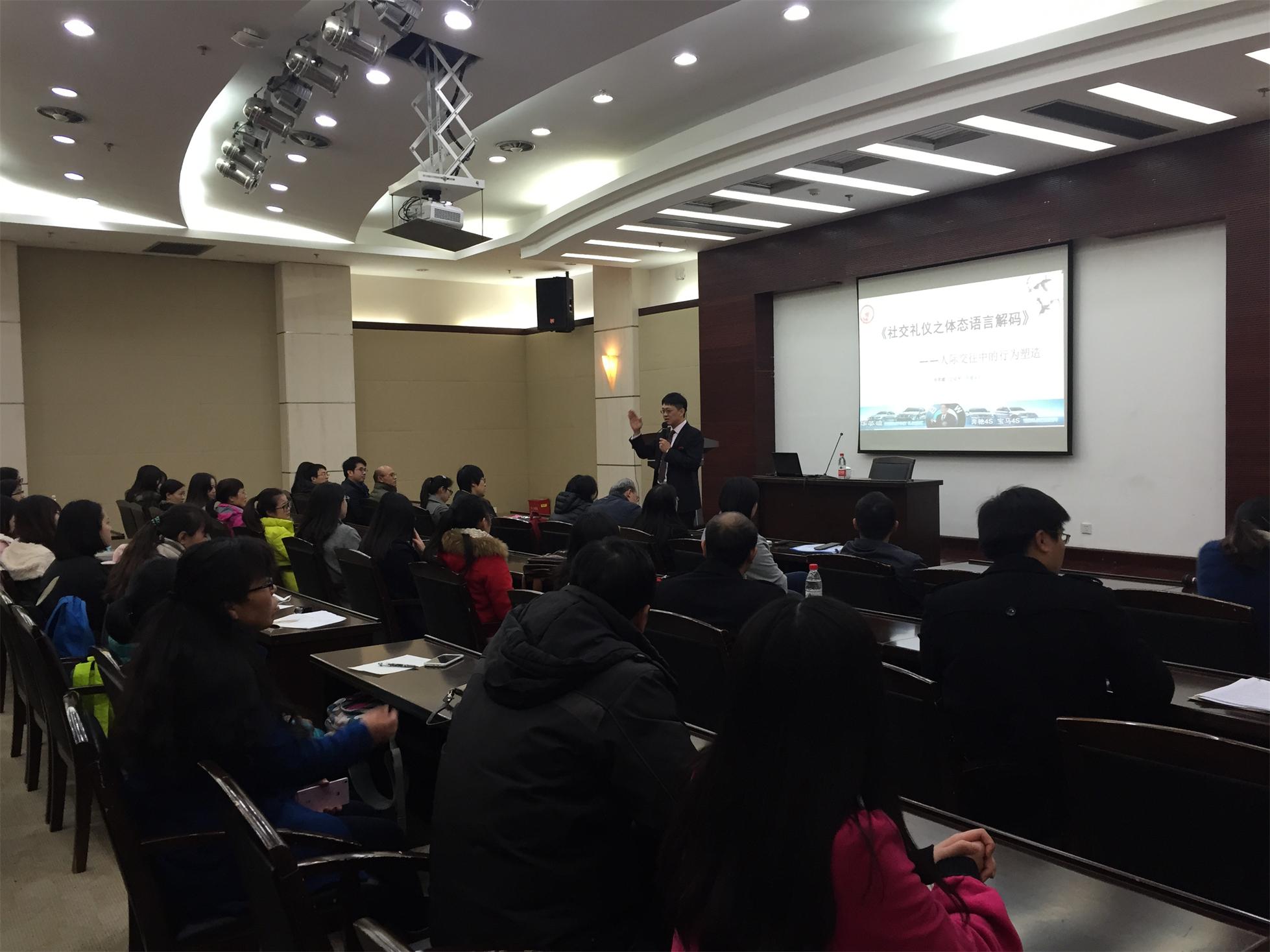 ?xml:namespace>12月7日,学校图文信息中心第三报告厅座无虚席,中国东方礼仪研究院院长华平生老师做客“博雅讲堂”报告会,并作了题为《社交礼仪之体态语言解码》的讲座。此次博雅讲堂由机械工程学院和服装学院主办,机械学院和服装学院的师生参加了此次讲座。