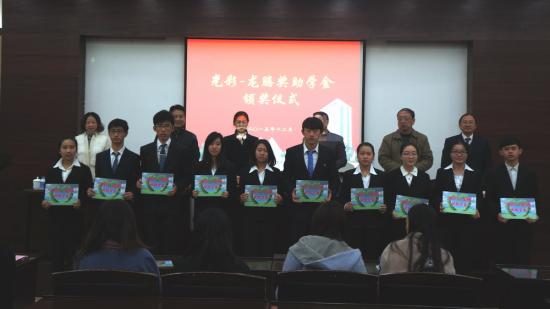 12月15日上午, 2015年“光彩-龙腾奖助学金”颁奖仪式在我校松江校区图文信息中心第三报告厅举行。校党委副书记、副校长裴小倩,中共松江区委统战部副部长、区工商联党组书记曹玉龙,松江区工商联副主席许明华,上海荣腾置业有限公司董事长马建军,以及我校学生工作部(处)处长徐阳,校团委书记朱蓓、艺术设计学院党总支副书记李云先及艺术设计学院辅导员,获奖受助学生代表出席了颁奖仪式。
