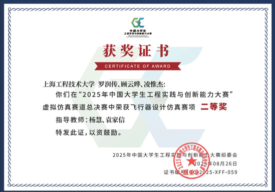近日,2025中国大学生工程实践与创新能力大赛在北京航空航天大学杭州国际创新研究院圆满落幕。在这场汇聚全国高校工程创新精英的巅峰对决中,我校航空运输学院“你说的队”参赛团队凭借出色表现荣获虚拟仿真赛道全国总决赛二等奖。