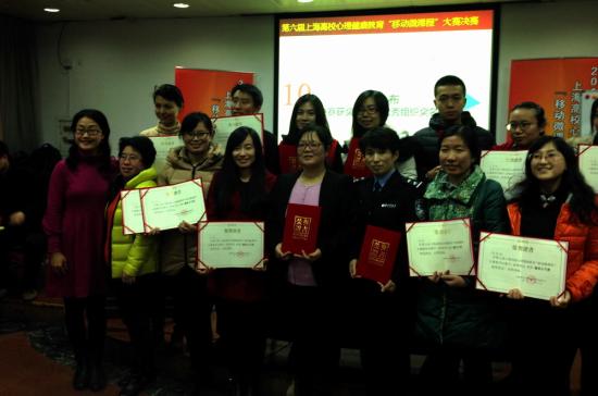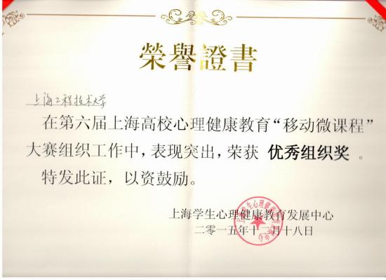 在近期举办的第六届上海高校心理健康教育“移动微课程”大赛中,我校获得优秀组织奖,机械工程学院董春亮老师获得决赛优胜奖,机械工程学院董春亮、电子电气工程学院李迎、轨道交通学院王瑞芳、高职学院赵青四位老师获得人气奖。