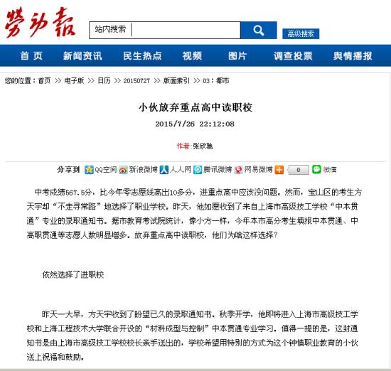 其中,由上海广播电视台制作,以我校“材料成型及控制工程”中本贯通人才培养模式试点专业学生高辰在中考后选择报名进入上海市高级技工学校——上海工程技术大学中本贯通专业学习为主要内容的专题报道——“高分读职校,你来吗?”获新闻报道类二等奖;由劳动报制作,以“材料成型及控制工程”中本贯通专业学生方天宇中考成绩567.5分,比零志愿线高出10多分,却“不走寻常路”地选择了职业学校的事迹为内容的报道——“小伙放弃重点高中读职校”获新闻报道类三等奖。