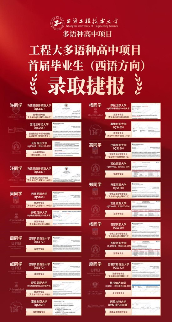 西班牙语方向,学生们表现尤为突出。既有巴塞罗那大学(QS 160)、巴塞罗那自治大学(QS 172)、马德里康普顿斯大学(QS187)、庞培法布拉大学(QS 265)等世界知名院校。同时,还揽获了瓦伦西亚大学、格拉纳达大学、塞维利亚大学、萨拉戈萨大学、阿利坎特大学等全球排名前500的欧洲知名公立院校的OFFER。录取专业涵盖视听传媒、广告及公共关系、设计学、营销及活动管理、酒店管理、企业管理、旅游学等热门领域。
