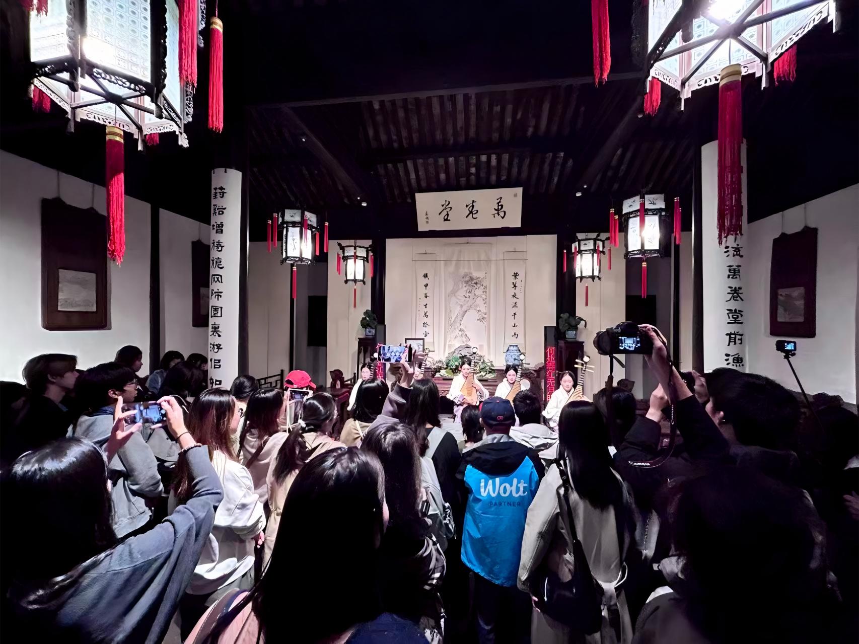 本次课程以一场独特的网师园夜游拉开序幕。在朦胧夜色与典雅灯影中,学生亲身感受评弹与昆曲的婉转韵律如何与园林的亭台水榭共鸣,深刻理解了古典园林“声景互融”的美学智慧与“天人合一”的哲学内涵。