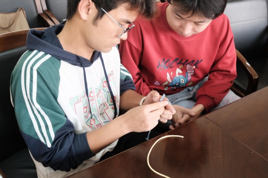 本次活动特别邀请了学院关工委委员孙荪老师担任指导。孙老师首先为大家梳理了中华编织艺术悠久的历史脉络,从结绳记事的远古智慧,到精美绝伦的宫廷织造,再到融入现代生活的时尚设计,生动诠释了“承脉”的深刻内涵。在她的悉心指导下,师生们纷纷动手,现场气氛热烈而温馨,相互交流、彼此协作,分享着创作的喜悦与心得。一根根彩线在指尖穿梭,不仅编织出精美的作品,更编织出跨越代际的师生情谊与和谐共生的文化氛围,生动诠释了“共生”的理念。