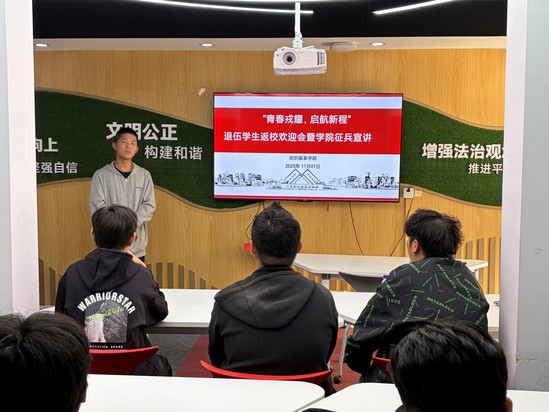 为激发青年学生参军报国的热情,11月1日,纺织服装学院以“青春戎耀,启航新程”为主题,开展了退伍学生返校欢迎会暨2025年征兵宣讲活动。活动特邀2025年秋季退伍毕业生钟岑以及学院有参军意向的学生共同参加,通过“军旅故事分享+政策深度解读+互动答疑”的形式,共赴一场关于青春与国防的对话。