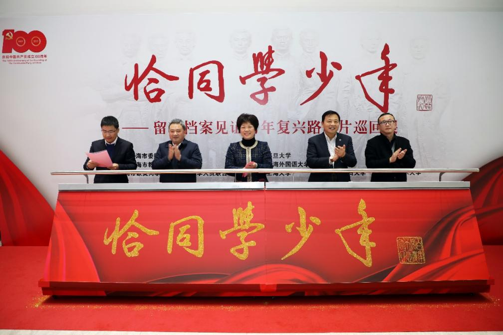 上海市欧美同学会副会长周敏,松江区委常委、统战部部长朱大章,松江区委统战部副部长荆颂,校党委副书记史健勇,校党委常委、统战部部长朱洪春,共同启动了本次巡回展。
