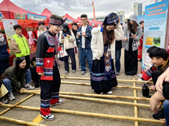 “竹竿舞”社团学生带领观众随着节奏互动跳跃,在轻松欢快的氛围中传递民族体育文化的活力,展现我校学子自信向上的青春风貌。