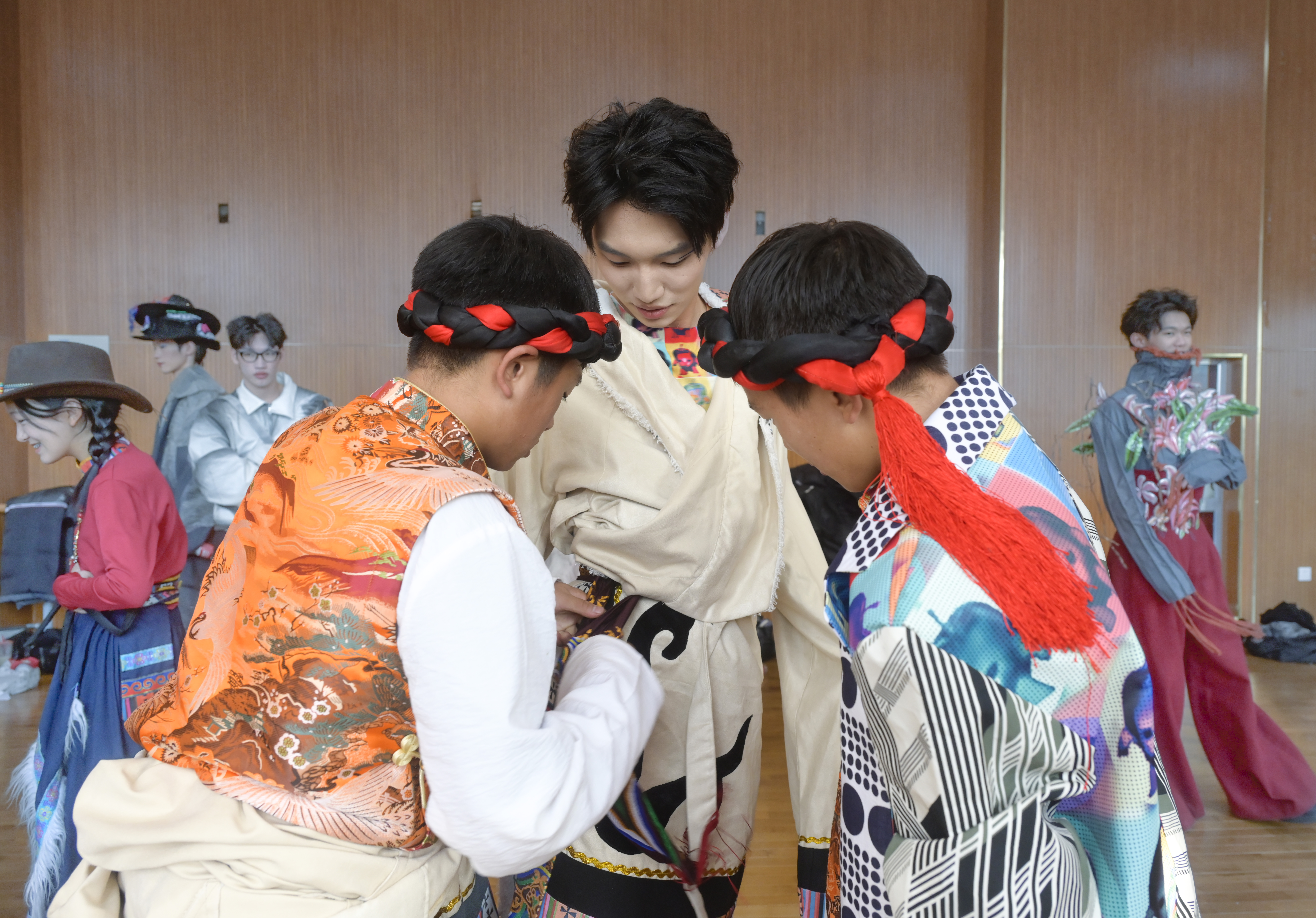 演出结束后,我校学生与果洛西宁民族中学的学生围坐一堂,分享服装的设计思路。果洛的学生热情地介绍了藏族服饰的纹样寓意与文化传承。当海派时装遇上藏式氆氇长袍,双方学生兴致勃勃地开启服饰交换穿搭体验。