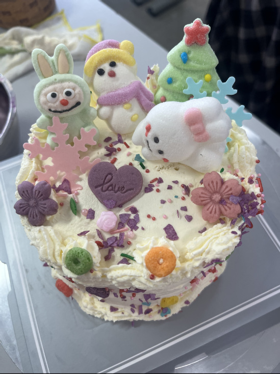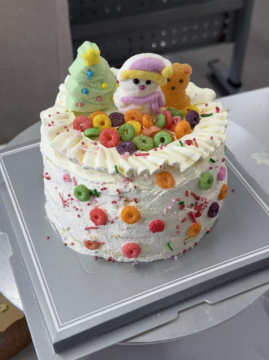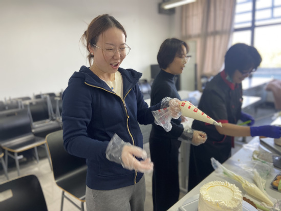 专业烘焙师现场指导,女教师们化身“甜点师”。从称量配料、打发奶油到裱花装饰,大家分组协作,时而交流烘焙心得,时而互相帮助解决操作难题。实验室的严谨与烘焙的创意碰撞出别样火花:有小组设计“拉布布蛋糕”造型,将流行特色融入甜品;更有小组创作“五彩缤纷”糖霜图案。实训中心4418变身“甜蜜工坊”,笑声与赞叹声此起彼伏。
