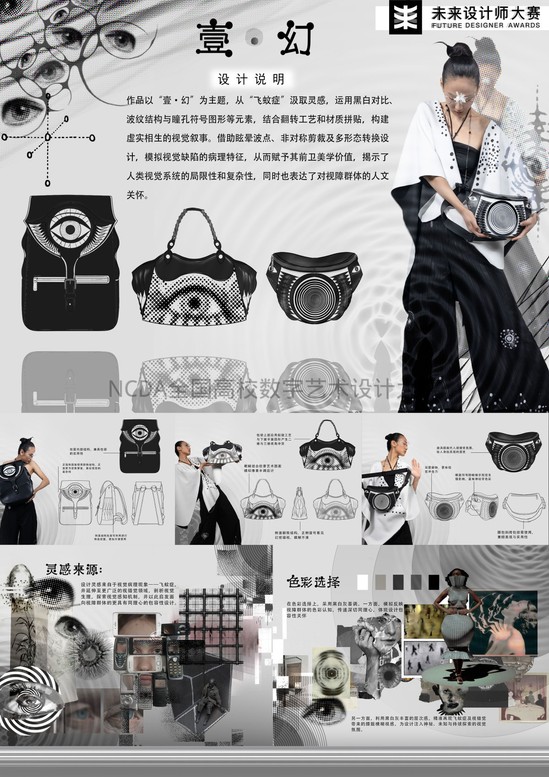 作品简介:设计以“壹·幻”为主题,从“飞蚊症”汲取灵感,运用黑白对比、波纹结构与瞳孔符号图形等元素,结合翻转工艺和材质拼贴,构建虚实相生的视觉叙事。借助眩晕波点、非对称剪裁及多形态转换设计,模拟视觉缺陷的病理特征,从而赋予其前卫美学价值。揭示了人类视觉系统的局限性和复杂性,同时也表达了对视障群体的人文关怀。