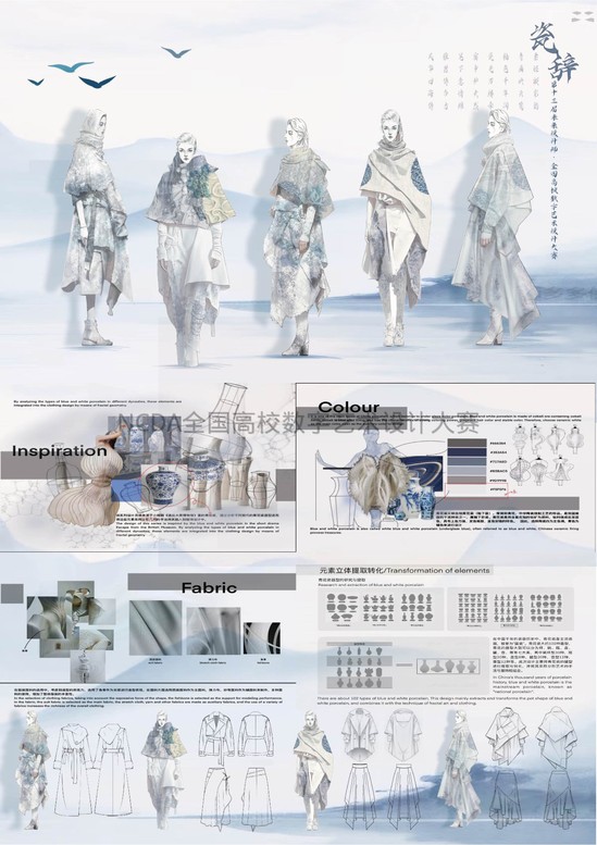 作品简介:《瓷辞》 系列以青花瓷为精神内核,运用分形几何重构传统水墨意境。蓝白渐变面料模拟釉色流动,数码印花将冰裂纹转化为无限递归的曼德博图纹,隐喻微观与宏观的哲学同构。立体剪裁通过参数化褶皱形成自相似肌理,解构式廓形在破碎中建立秩序,暗合道家“大制不割”的辩证思维。衣身线条随人体曲线延伸,如青花笔触游走于器形与虚空之间,诠释东方美学中“器以载道”的造物哲学。本系列以数学逻辑重释传统工艺,探寻有限形制与无限意境的共生可能。