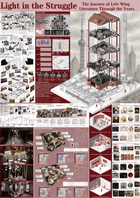 作品简介:本设计以“Light in the Struggle(曲折中的光芒)”为主题,选址于上海左翼作家联盟旧址片区,通过空间叙事的手法呈现中国左翼文学的发展历程与精神传承。整体设计以建筑为媒介,以文字为线索,构筑出一个跨越时空、触动人心的红色文化场域。