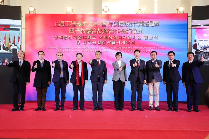 在与会领导嘉宾见证下,上海工程技术大学与上海设计之都促进中心签署了战略合作框架协议,国际创意设计学院与中韩两国四家合作企业签署了产学合作协议。