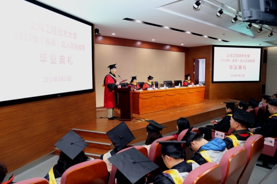 3月12日下午,2016年(春季)成人高等教育毕业典礼在长宁校区举行。副校长鲁嘉华出席了毕业典礼,继续教育学院姚黎明院长、李军书记,继续教育学院副院长胡建平、张瑜,以及毕业生代表共200多人参加了毕业典礼,毕业典礼由姚黎明院长主持。