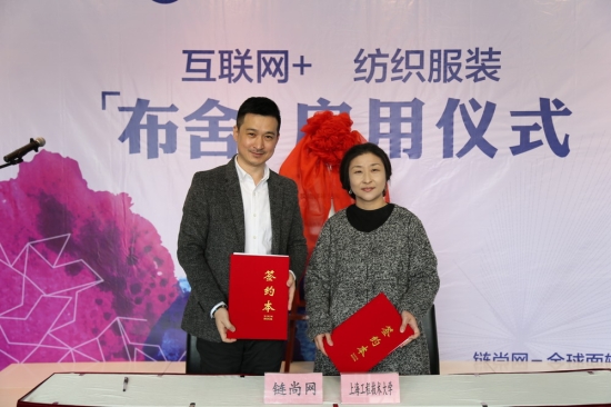仪式上副校长鲁嘉华和链尚网创始人兼董事长赵俊浩为【布舍】启动揭牌,为链尚网颁发了产学研用合作教育基地铭牌,教务处处长谢红与链尚网创始人兼董事长赵俊浩签署了实习实践教育基地协议,服装学院党委书记袁蓉介绍了【布舍】筹备情况。