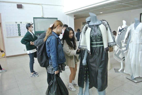 此次展示的服装有旗袍、皮草、真丝等10余套成品,包含服装学院教师袁蓉、郑彤、王晓娟的成衣系列设计作品。展示中,我院师生就设计理念、服装材质、制作工艺等韩方师生感兴趣的问题一一介绍,同学们积极参与互动交流并亲身体验学院师生设计制作的中国旗袍,纷纷合照留念,取得了良好的展出效果。