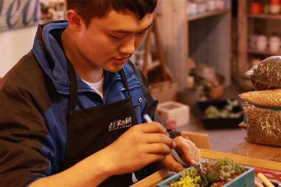 “我是一个多肉控,一直希望能在闹市中拥有一家属于自己的花店,于喧嚣中守住自己内心的宁静。”王念龙从大一时就开始自己大面积的在宿舍尝试种植多肉,尽管因为一次山东采风,一个月无法照料多肉导致多肉的养殖“无疾而终”。但是,他心中始终有着多肉的一方天地。