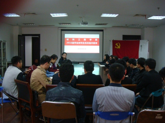 4月12日上午,材料工程学院在行政楼1612会议室,举行了2016届研究生毕业生党员党性教育活动。学院党委副书记、组织员、党支部书记、辅导员及全体研究生毕业生党员参加了教育活动,会议由研究生辅导员宋潇芃主持。