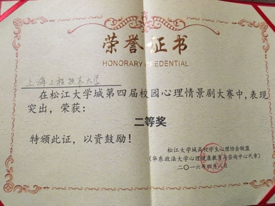 在近期举办的第四届松江大学城校园心理情景剧大赛中,我校获得二等奖。