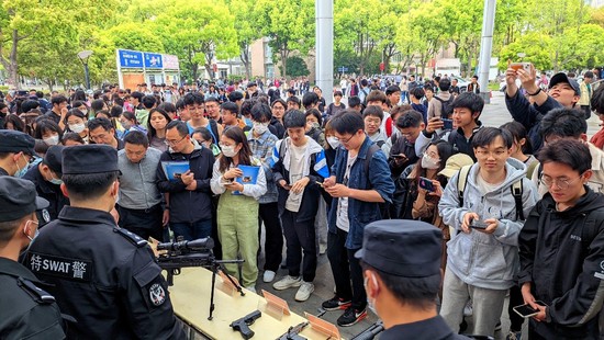 4月14日中午12时在松江校区一食堂广场,保卫部(处)邀请松江区公安分局大学城派出所、治安支队、特警支队、反恐支队进行415国家安全日联合宣教及演练,此次活动是松江区特警支队首次进入我校校园。现场,训导员带领警犬表演了服从、扑咬等各种动作,现场学生热情积极参与到本次活动中。良好的互动使得演练现场气氛热烈,活动取得良好效果。那虎虎生风的防暴犬、缉毒犬,英姿飒爽的特警演练,尤其是各种各样的反暴恐利器的展示,赢得在场全体师生的阵阵热烈掌声。