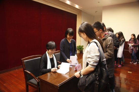 讲座尾声,淳子老师与艺术设计学院党总支书记许传宏举行《花开——张爱玲上半出》赠书仪式。随后淳子老师与现场热情的同学们进行了提问交流。精彩的讲座结束后,淳子老师进行了现场签名赠书活动。