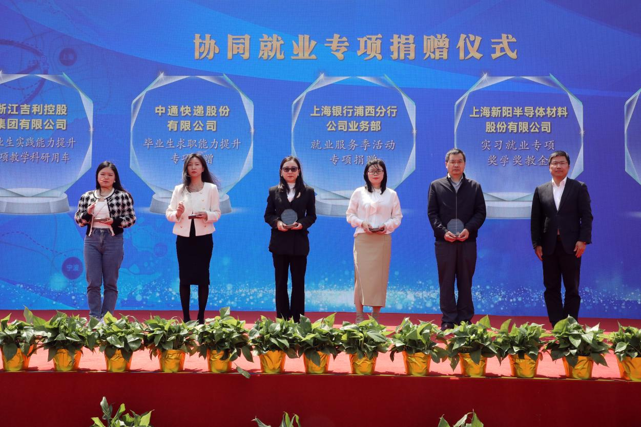 校党委常委、组织部部长朱洪春向为学校就业工作提供专项捐赠的松江区工商业联合会、上海新阳半导体材料股份有限公司、上海银行浦西分行、中通快递股份有限公司、浙江吉利控股集团有限公司,颁发协同就业特别贡献奖。