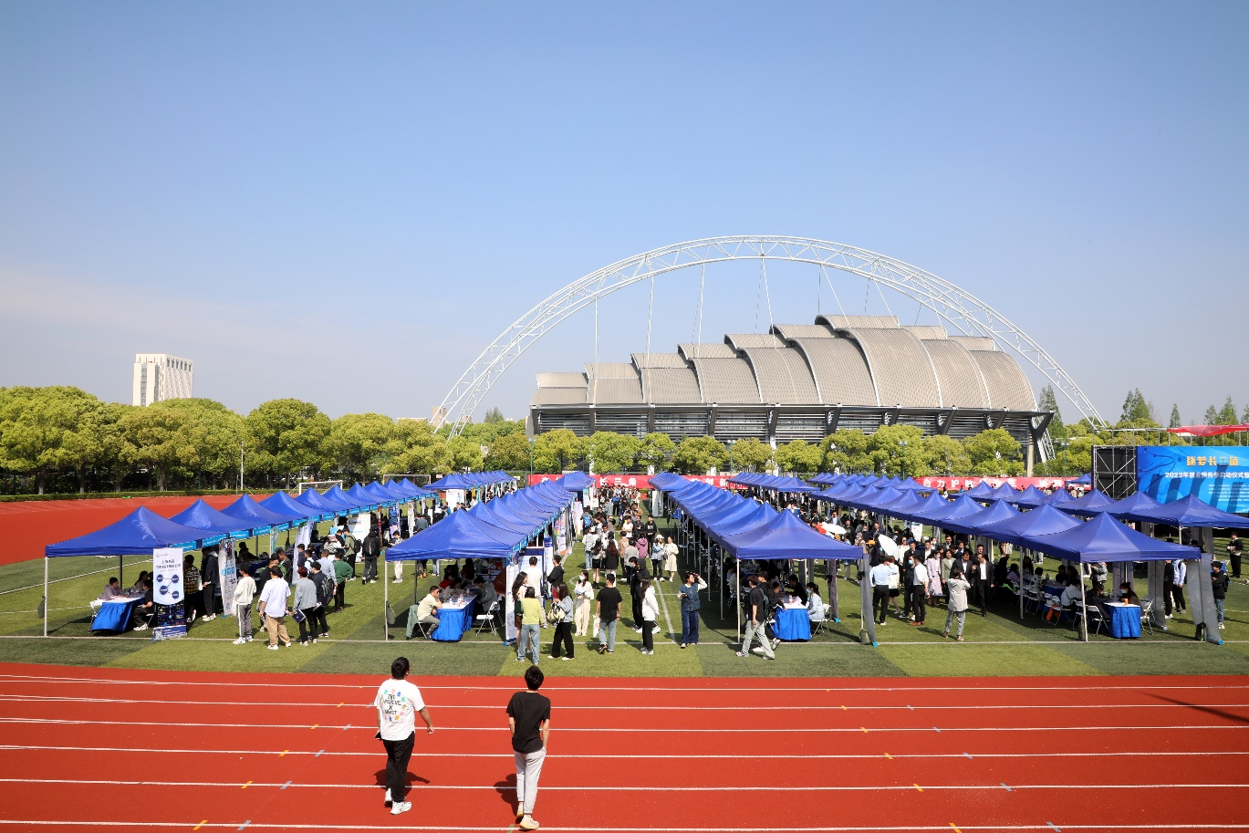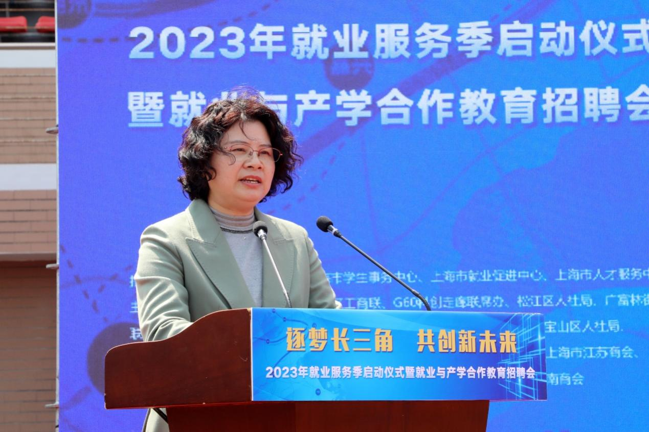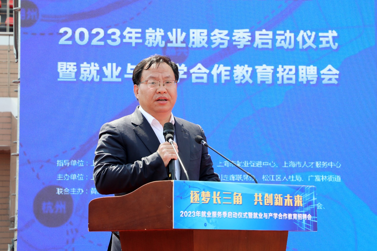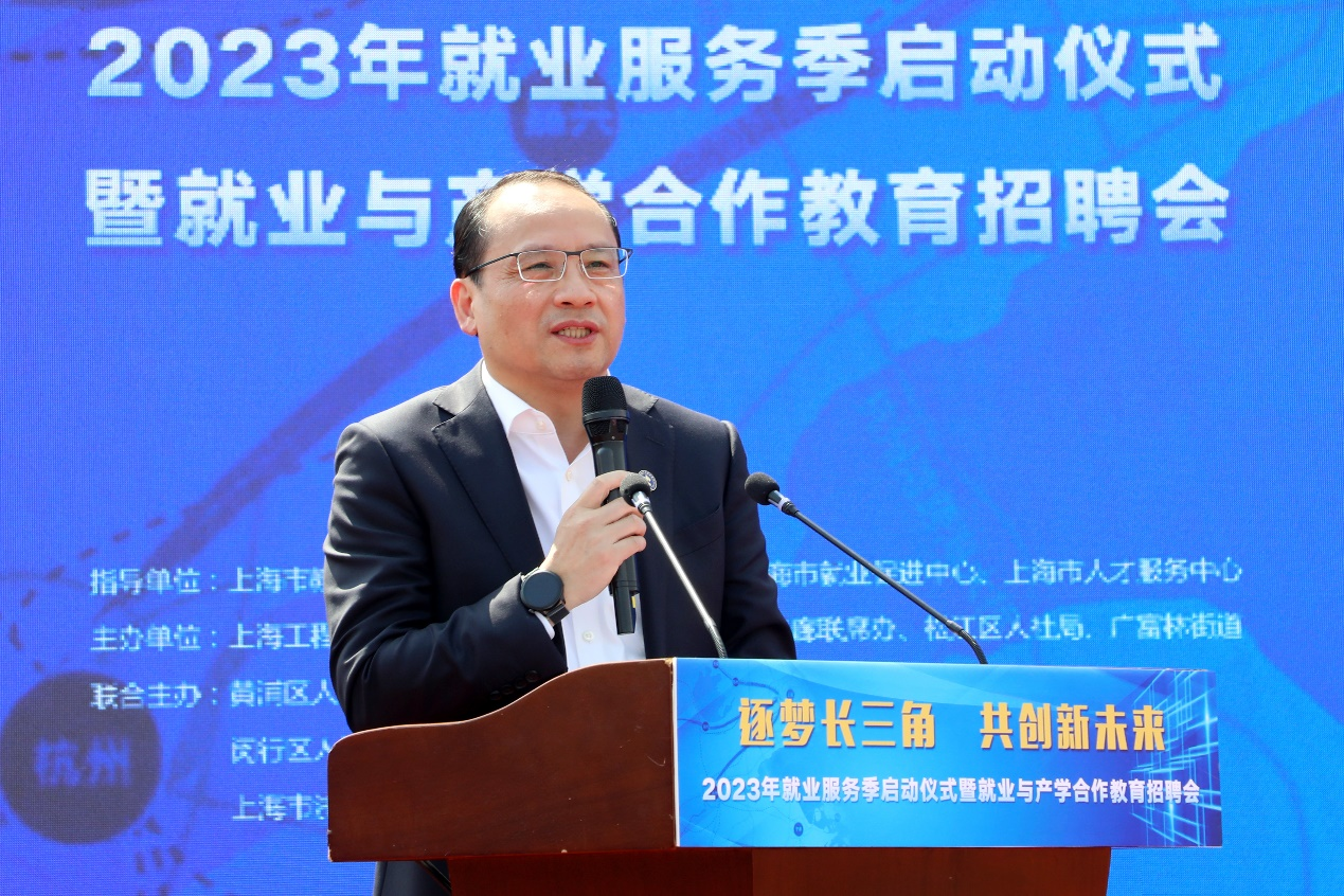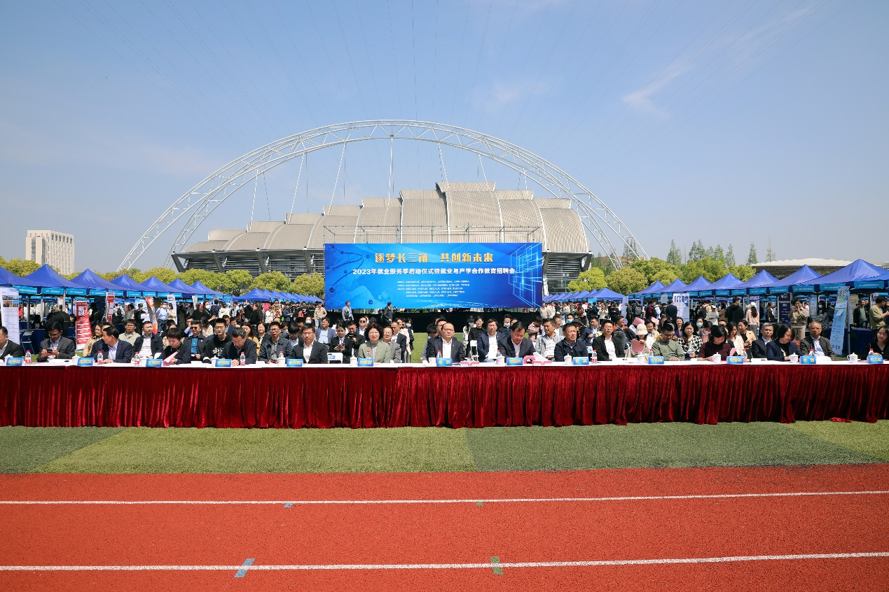为深度服务长三角一体化高质量发展,积极打造“协同育人共同体”,全力推动毕业生高质量充分就业,4月27日下午,由上海市教委学生处、上海市学生事务中心、上海市就业促进中心、上海市人才服务中心指导,我校与松江区工商联、G60科创走廊联席办、松江区人社局、广富林街道联合主办,上海市部分区人社局、上海市江苏商会、上海市浙江商会、上海市安徽商会、上海市山东商会、上海市云南商会协办的“逐梦长三角 共创新未来”2023年就业服务季启动仪式暨就业与产学合作教育招聘会在松江校区西体育场举行。