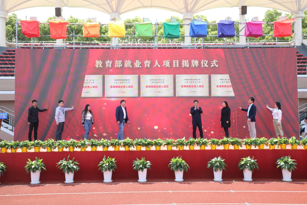 赵猛主任与浙江吉利控股集团有限公司华东大区甘晓霞经理、亚马逊云科技亚太区负责人刘龑、上海家树建设集团有限公司副总裁任晓春、蔚来控股有限公司高校合作负责人陈骞、中通快递股份有限公司人力资源中心招聘主管王博、恒泽丰悦(北京)企业咨询有限公司上海代表处负责人徐昀昉、清飞信息科技(上海)有限公司总监史恩龙,共同为学校获批的教育部就业育人项目揭牌。