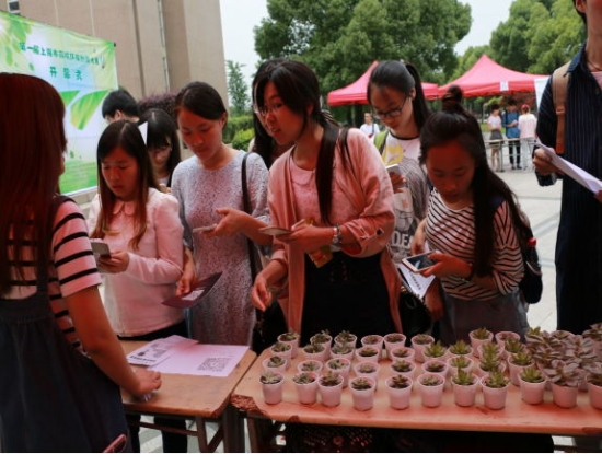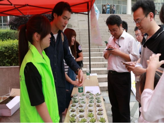 在乐队精彩演奏的背景乐中,四位嘉宾共同将本次大赛主题“益起环保,绿意生生”的环保字粘贴在背景墙上,梅老师宣布首届高校环保创意大赛正式启动,拉起了本次开幕式的序幕。身着绿色马甲的志愿者们早已摆好摊位,等待下课的师生们参与活动。活动现场不仅有魔法种子种植的演示,绿色盆栽领养,金点子大赛现场抽奖这些有趣的项目,来自艺术学院的周同学携带着自己手绘的明信片也参加了本次开幕式活动,作为艺术生的他,生活中已经是一个“绿色达人”,自备餐具少用一次性物品是他一直以来的习惯。这次活动希望用自己的手绘作品向周围人传达绿意。他称赞这次活动很棒,给周围的同学影响很大。市民腾先生已是绿色公益活动的常客,他认为现代生活的雾霾天气和人们忽视生态有着密不可分的关系。为了下一代着想,腾先生积极奔走于各个绿色公益活动,与同学们交流经验,借鉴他们的环保理念,从而不断更新自己的环保观念。