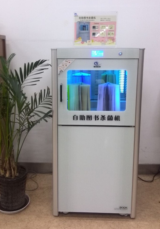 新引入的杭州福诺科技公司的“福诺”牌“自助图书杀菌机”置于图书馆一楼第一借阅室,专门用来为图书除尘和杀菌。它的外形酷似一台小型电冰箱,拉开箱门,将图书放在支架上,关上门,按下按钮,机器开始运作。这时可以透过玻璃窗看到机器内部发出紫色的光线照射书页,书在风的吹动下,均匀的散成扇形,每页都接触到射线。经过30秒的快速紫外线杀菌,就能去除各种细菌、病毒和异味。