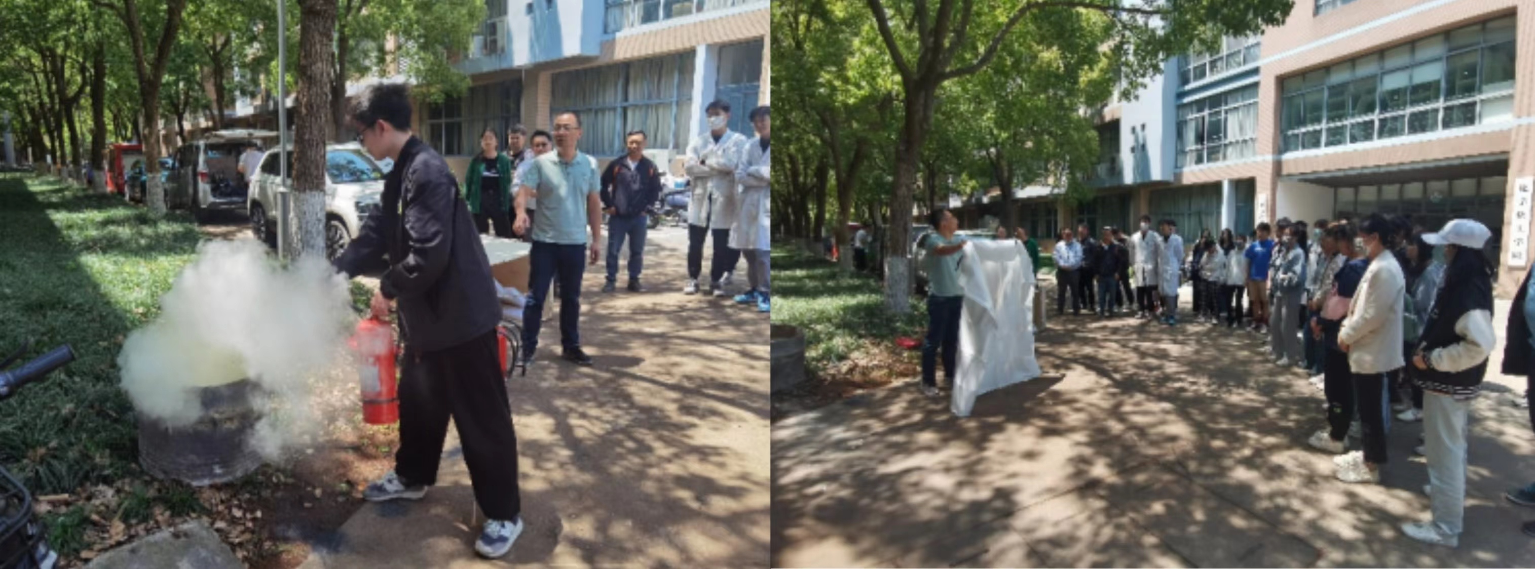 逃生演练结束后,保卫处消防科吴挺老师对学生进行了灭火器、灭火毯实操培训,并现场演示了灭火器和灭火毯的使用,在场的学生们在学习与演练的过程中进一步加深了对消防器材使用方法的理解与认识,并掌握了灭火器和灭火毯的使用技能。