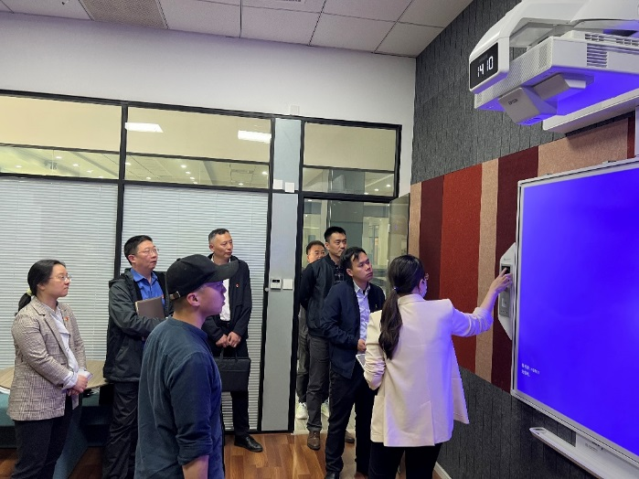 在上海现代高校智能后勤研究院副院长周琦玢带领下,调研团队参观了上海市高校后勤动态数据显示屏、智慧录播室、智慧教室、模块化静音舱、餐厨系统及智能化宿舍等展示空间,详细了解了上海现代高校智能后勤研究院在支持高校后勤服务信息化、智慧化过程中所做的工作。参观结束后,双方围绕我校目前后勤信息化建设中遇到的问题展开了交流和讨论。