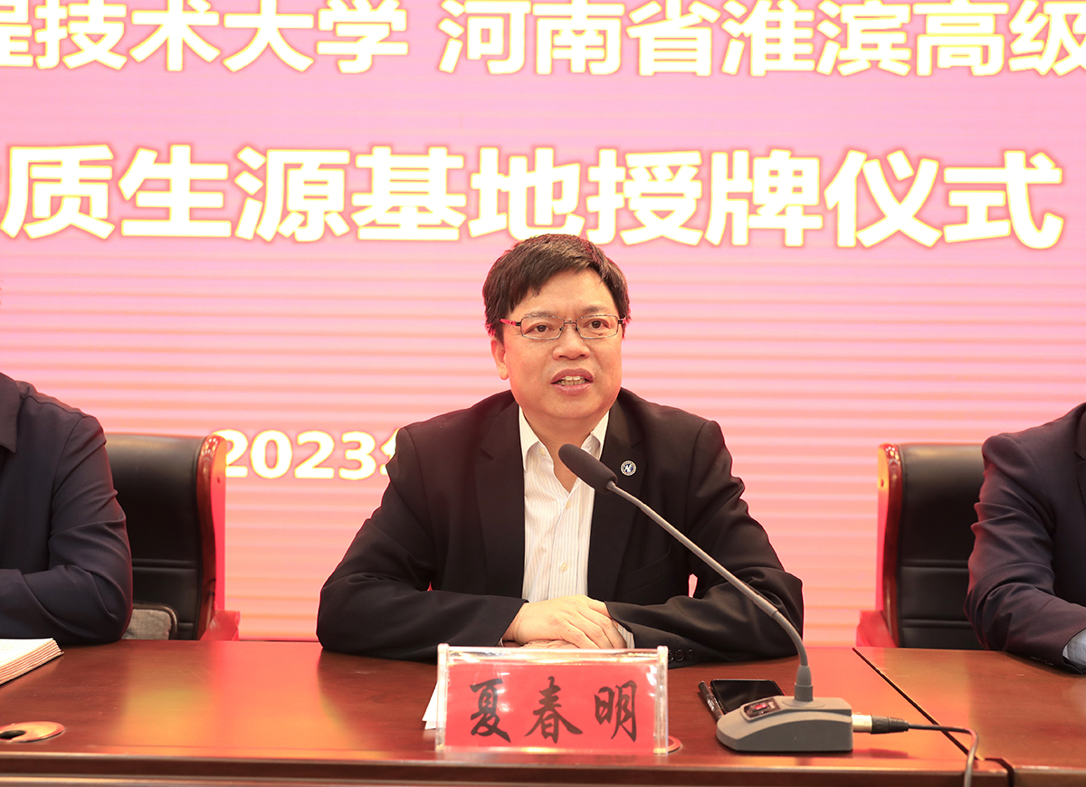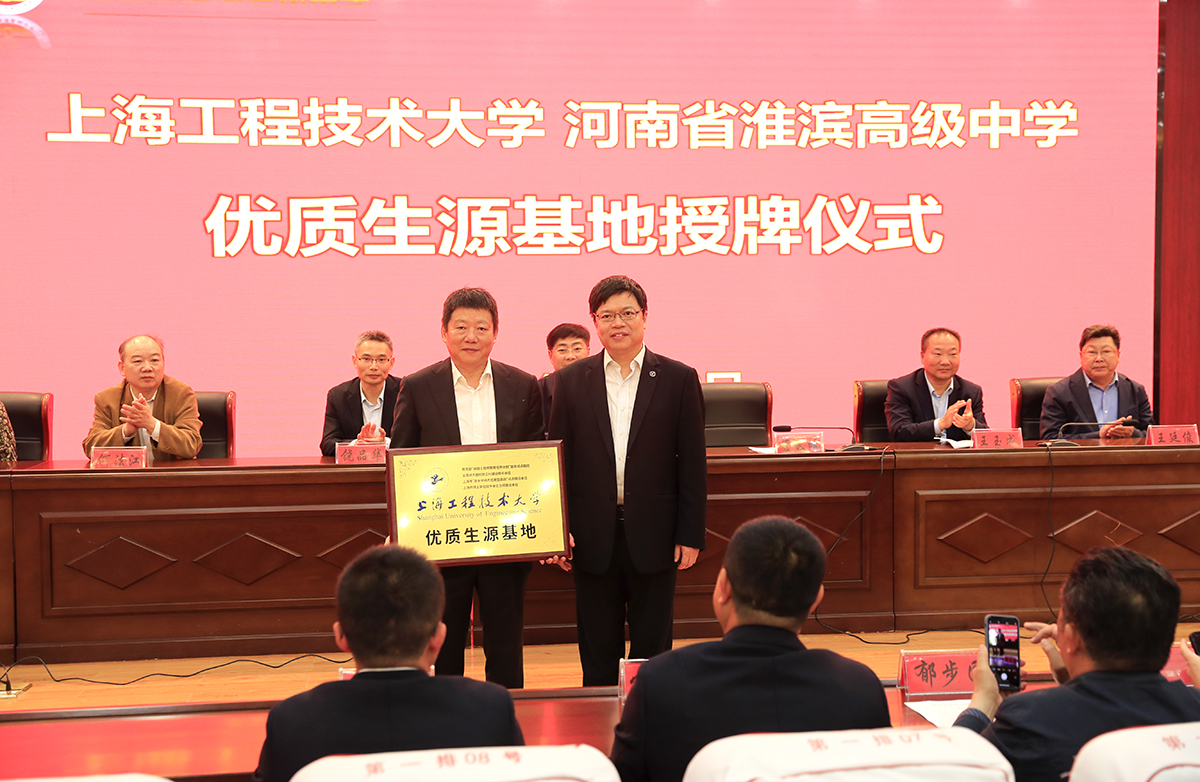 淮滨高中李明校长代表学校对上海工程技术大学夏春明副校长一行的到来表示热烈的欢迎和诚挚的谢意。他表示,上海工程技术大学“优质生源基地”挂牌是对淮滨高中办学理念、学生素质和育人成果的充分肯定和信任。学校将坚定不移走特色发展之路,坚定目标方向,不懈努力奋斗,用卓越的意志品质和能力素养,迎接挑战,接受挑选,成就美好未来。