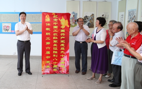 李江书记、夏斯云副书记共同为纪念建党95周年、纪念红军长征胜利80周年退休教职工第六届书画展揭幕,并与老同志们共同欣赏了书画作品,此次共展出书画作品50余幅。校领导亲切慰问书画作者,高度赞扬老同志们热爱书画艺术、保持健康向上精神追求的良好风貌。活动现场,校退休教职工合唱团满怀激情地演唱了《长征组歌——告别》、《我和我的祖国》等歌曲,退休教职工剑舞队神采奕奕地展示了她们婀娜的舞姿,精彩的表演展示了我校退休教职工奋发向上的精神风貌,赢得了全场阵阵热烈的掌声。校工会常务副主席沈海庆宣读了获得“2016年上海市高校退休教职工桥牌比赛”获奖人员名单,夏斯云副书记向获奖人员颁奖并颁发了纪念品。
