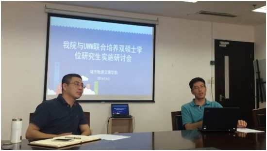 2015年9月以来,城市轨道交通学院与威斯康星大学密尔沃基分校(UWM)交通研究中心主任、国际交流中心主任刘玥就双方联合培养双硕士学位研究生项目开展了多次交流与沟通,目前已进入最后签约阶段。6月28日,学院和刘玥主任再次就双方联合培养双学位硕士研究生项目具体实施要点召开了研讨会,学院柴晓冬院长、刘牧众书记、刘志钢副院长和全体硕士生导师参加了会议。