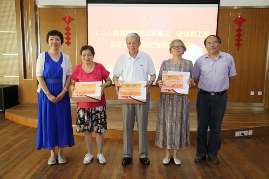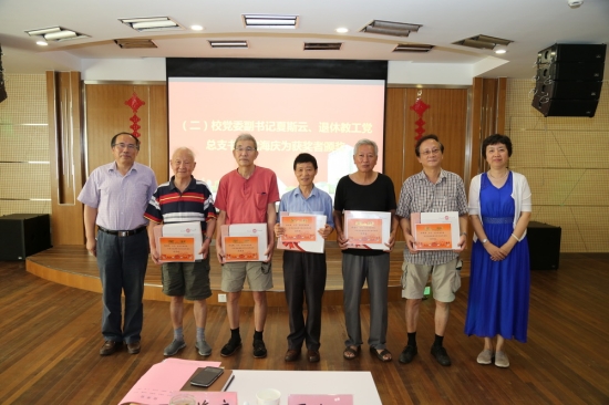 会上,表彰了退休教职工第六届书画展获奖人员,胡宗孝等10位同志荣获退休教职工第六届书画展优秀奖,曹丽纳等7位同志荣获优胜奖。校党委副书记夏斯云、退休教工党总支书记沈海庆共同为获奖人员颁奖。