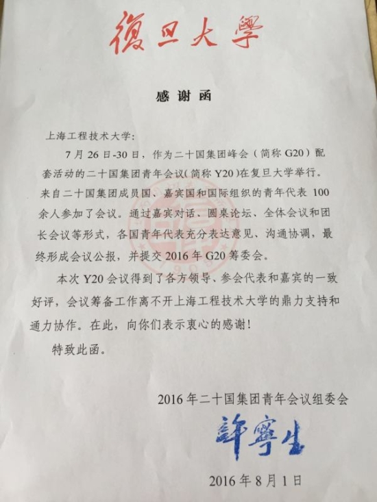 7月26日-7月30日,由中华全国青年联合会主办、复旦大学承办、上海市教委、上海市青年联合会及中国青年报社协办的二十国集团青年会议(简称Y20)在沪举行。