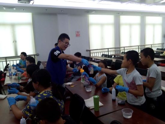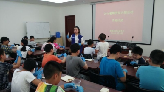 为了充分结合自身专业特色,将专业知识用最简练易懂的语言带进社区,向居民们宣传在日常生活中可以使用的科普技巧。服装学院科学商店的志愿者们于 7月27日下午来到上海市纺织工程学会科普基地——松江区佘山镇翠鑫苑社区,开展了以“手帕印染饰生活”为主题的活动。