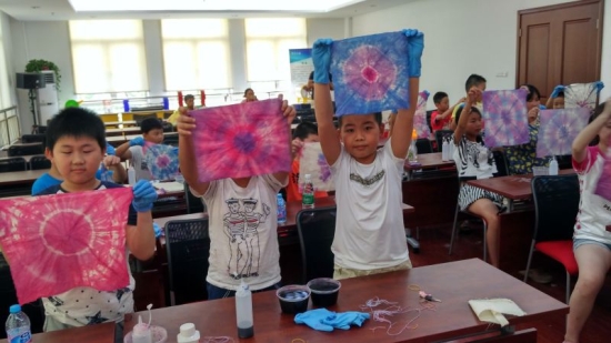 志愿者们还向小朋友们详细介绍了与传统印染原理相挂钩的手帕印染小知识,此次织物印染所涉及到的材料都是与日常生活有关的,并且可以在生活中唾手可得的,比如:普通手帕布、水、小壶、皮筋、染料、颜料等等。因此,在接触了一次的手帕印染手工教学的课程后,个人和家庭都可以简洁明了地掌握基础技能,并且可以在日后自主参与到手帕印染的设计中。现场的小朋友们在志愿者的主导下都制作出了两幅及以上的属于他们的独一无二的手帕印染艺术作品。