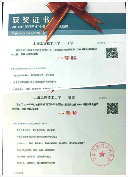 8月17日至21日,2016年“西门子杯”中国智能制造挑战赛全国总决赛在湖北宜昌三峡大学举行,来自北京交通大学、同济大学、上海交通大学等100所高校的301支队伍参加了总决赛,我校最终获三项一等奖,两项二等奖,同时我校还获得华东赛区一等奖1项、二等奖7项、三等奖6项,获奖总数创新高。