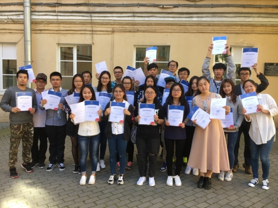 结业仪式上,Alexey教授依次为顺利结业的23位学生颁发结业证书,并且又单独为翁浩杰、韩亦阳等8位取得全5分成绩的学生颁发了优秀学员证书。Alexey教授随后为学生送上祝语,他首先肯定了我校学生两个月里表现出的积极的求知欲望、良好的学习态度和较高的学习能力;又赞扬了我校学生在异国他乡学习和生活过程中具备的较强适应能力;最后他表示,该项目的顺利完成预示着圣光机大学与上海工程技术大学首次开展交流合作的良好开端,希望以后该项目可以持续下去,并谋求更多合作的机会,也祝愿学生能将所学知识应用于以后的学习中,学有所用。