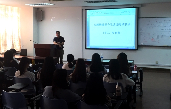 陆馆长从当前我国存在的对于非物质文化保护的问题说起,详细的介绍了非物质文化遗产保护的重要性。他讲到,作为青年一代,必须要重视且努力为非遗文化的保护做出贡献。讲座中,陆馆长着重为大家介绍了松江的文化底蕴,以及顾绣的前世今生,精彩的讲座让大家了解到顾绣是中国传统刺绣工艺之一,是上海地区工艺品中的瑰丽奇葩,其以技法精湛、形式典雅、艺术性极高而著称于世,2006年经国务院批准列入第一批国家级非物质文化遗产名录。