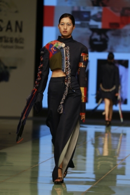 而中国学生李丹则大胆采用黑白红三色,对观众形成视觉冲击。对于中新交流项目,面对“匠意传承”的主题,她希望将中国文化的传承精神在服饰上体现。偶尔间从电影《聂隐娘》中获得灵感,她对汉服产生了兴趣。她毫不犹豫选取了古代汉服的领、襟、衽、衿、裾、袖、袂、带、韨的廓形,每一片廓形的裁剪和细节都融入了李丹的手工活和思考,加上时尚元素的点缀,让他的服装从历史走来,又褪去了八股的定式。当汉服与时装碰撞,当古代与现代碰撞,文化的传承和精神的发扬显露无疑。“匠心”就在文化的传承间,让服饰有了生命。